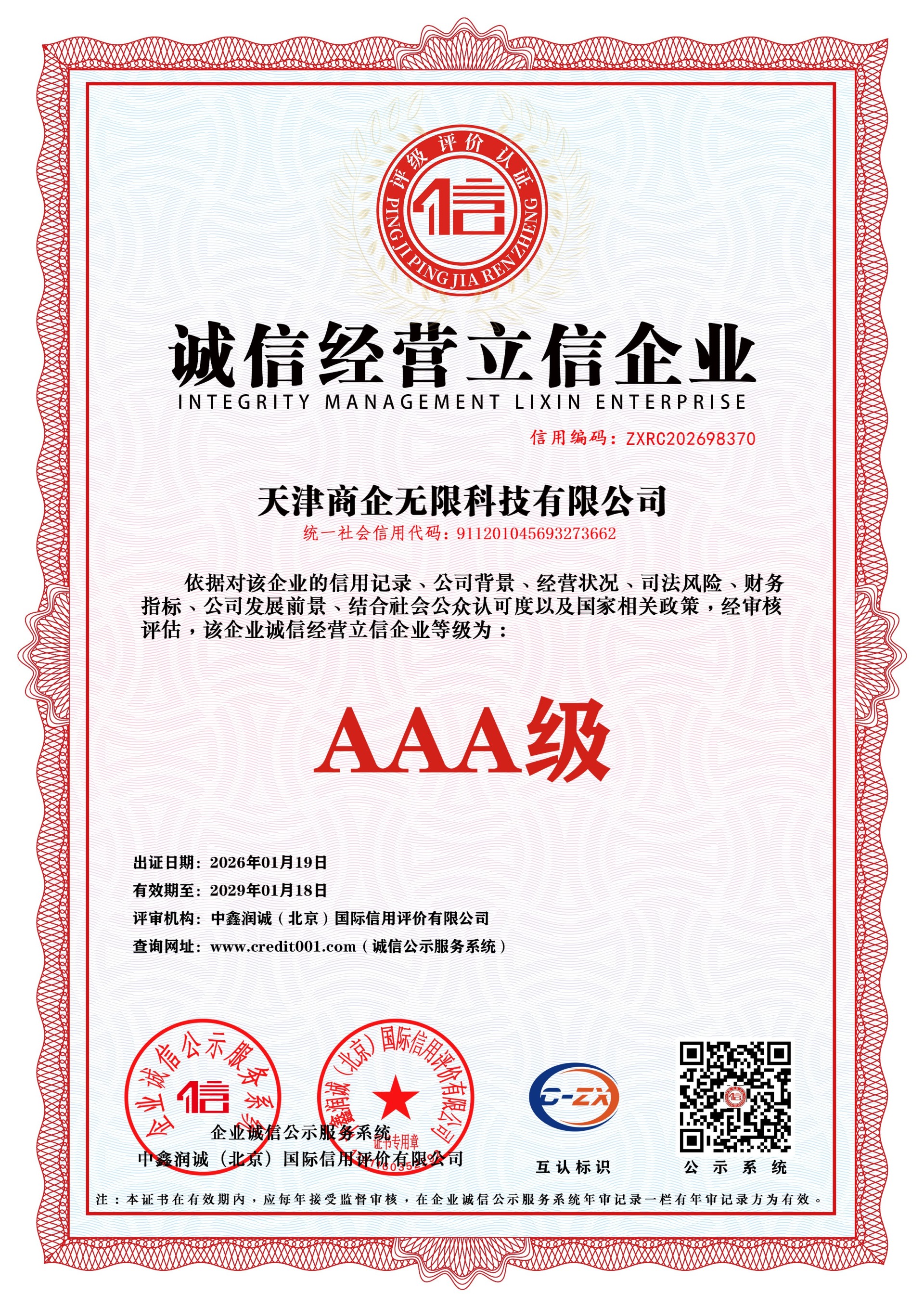企业信用等级证书
